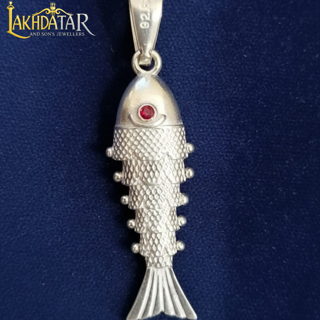 The focal point is a single, vibrant red gemstone (likely ruby or a similar colored stone) set as the eye, providing a beautiful contrast to the polished silver. The fish is a powerful symbol in many cultures, often representing good luck, prosperity, abundance, and fertility. This makes the pendant a perfect talisman or charm to wear for positive energy.