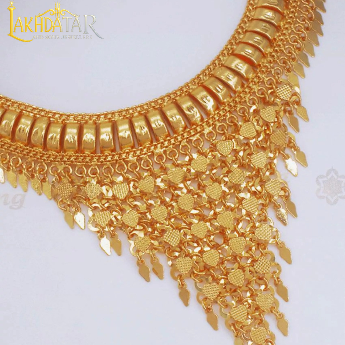 Celebrate tradition and grace with this Antique Kerala Gold Necklace, a masterpiece of heritage jewelry. Crafted with intricate detailing, the necklace features bold patterns and delicate danglings that highlight the richness of Kerala’s cultural artistry. Its broad, structured design symbolizes grandeur, while the cascading motifs add movement and charm to your look. This necklace is an ideal choice for brides, cultural ceremonies, and festive occasions, offering a regal touch to any ethnic attire. Exuding elegance, heritage, and sophistication, this piece stands as a true statement of timeless beauty.