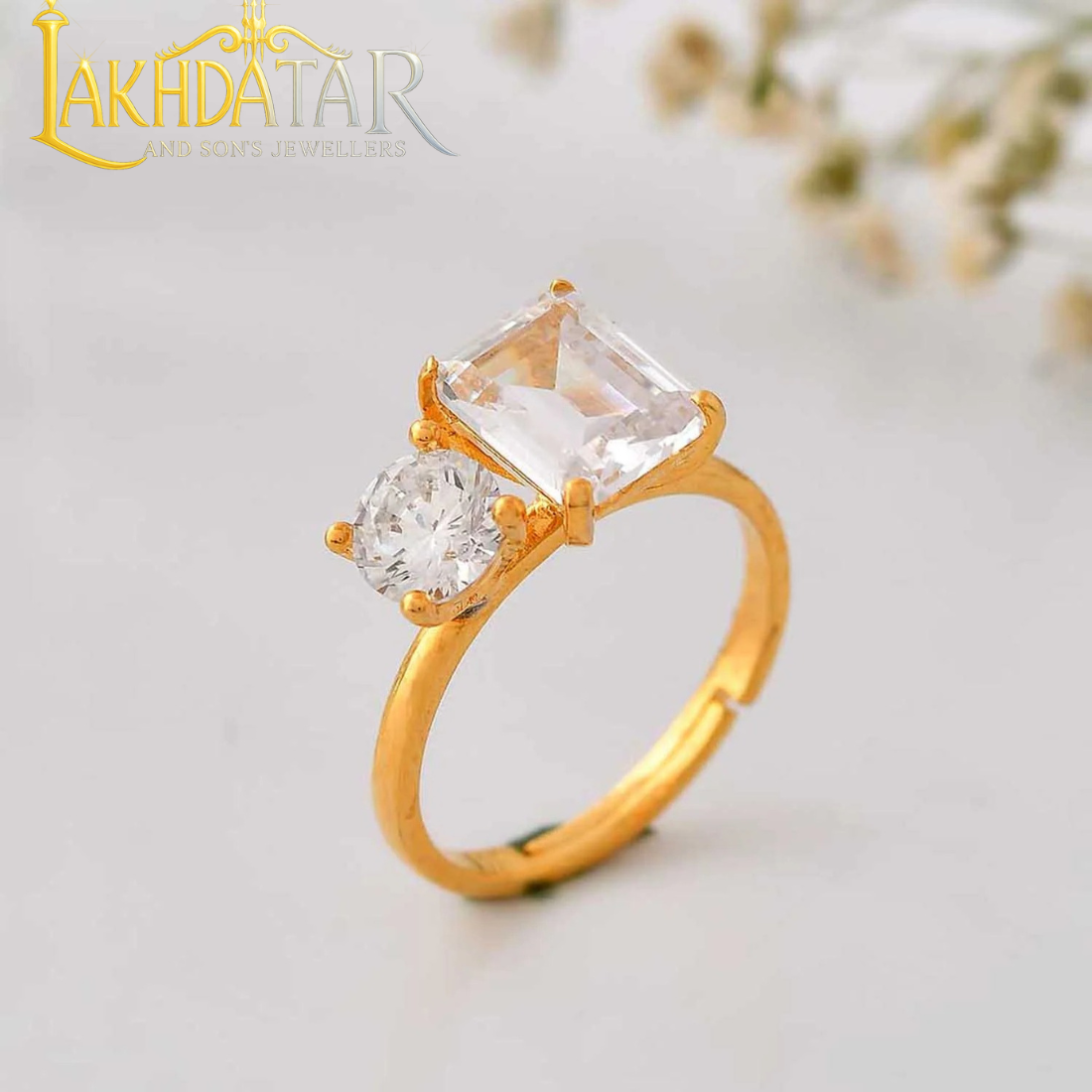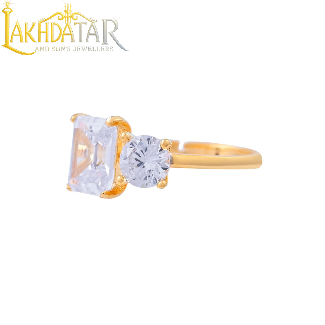 A striking yellow gold ring featuring two distinct diamonds — one round, one emerald-cut — symbolizing the perfect harmony of opposites. Elegant, radiant, and timeless.