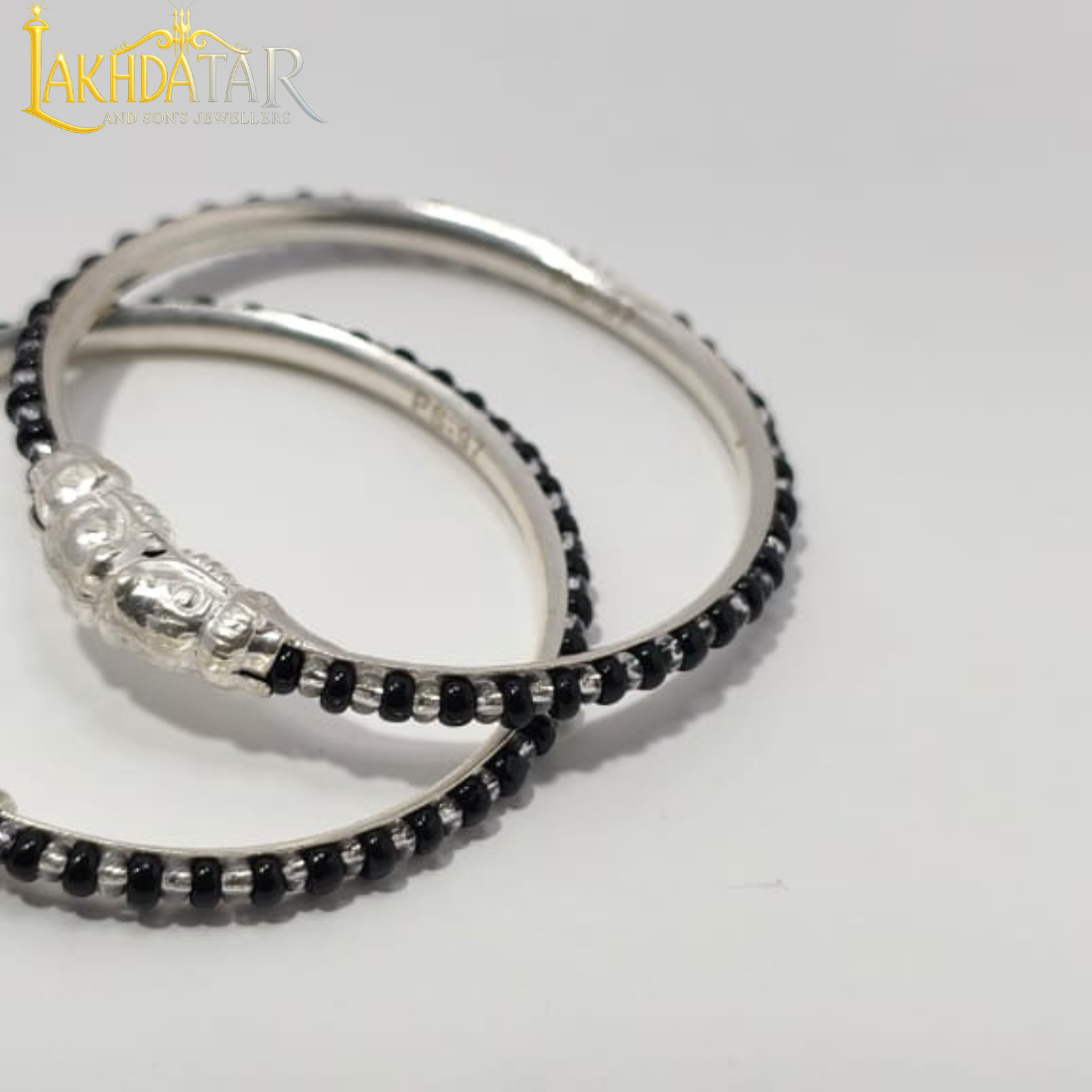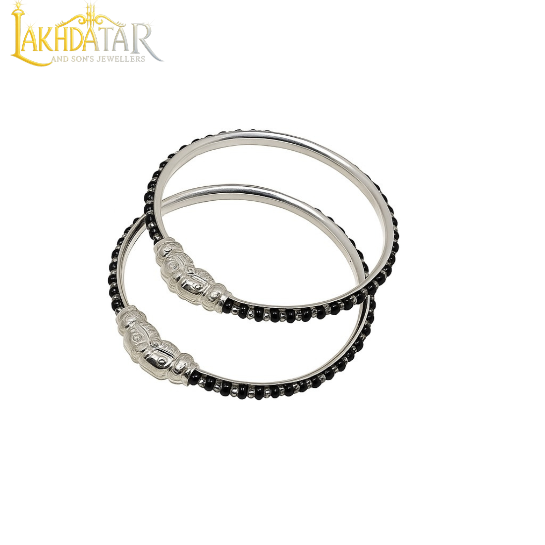 The design features a sturdy silver-plated or oxidized silver finish base. Half the circumference is adorned with a delicate line of small, sparkling black beads, which are a key element in the Nazariya style. The focal point of the bangle is a charming, intricately carved God motif (which appears to be Lord Ganesha) on a central cylindrical piece. The bangles have a smooth, polished finish on the inside for comfortable, daily wear.