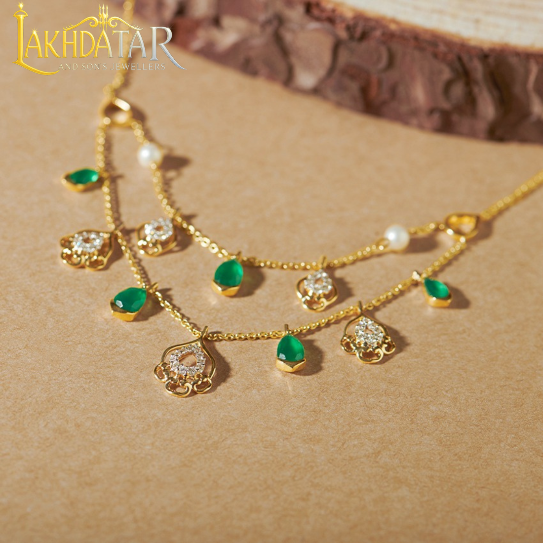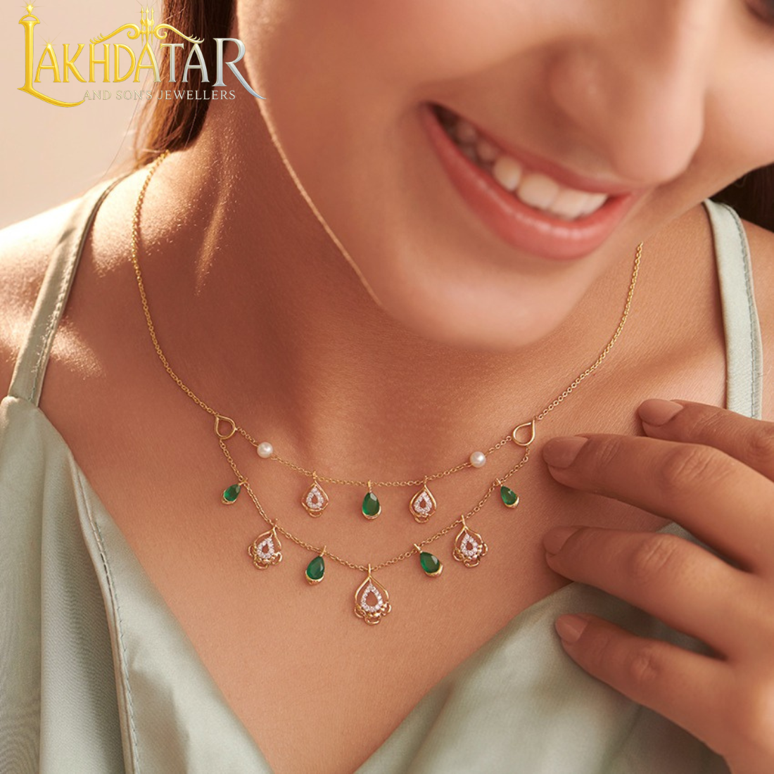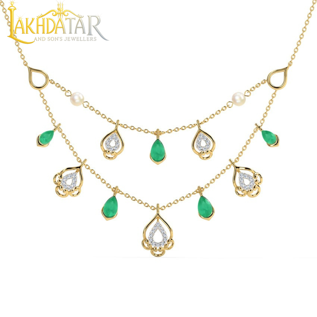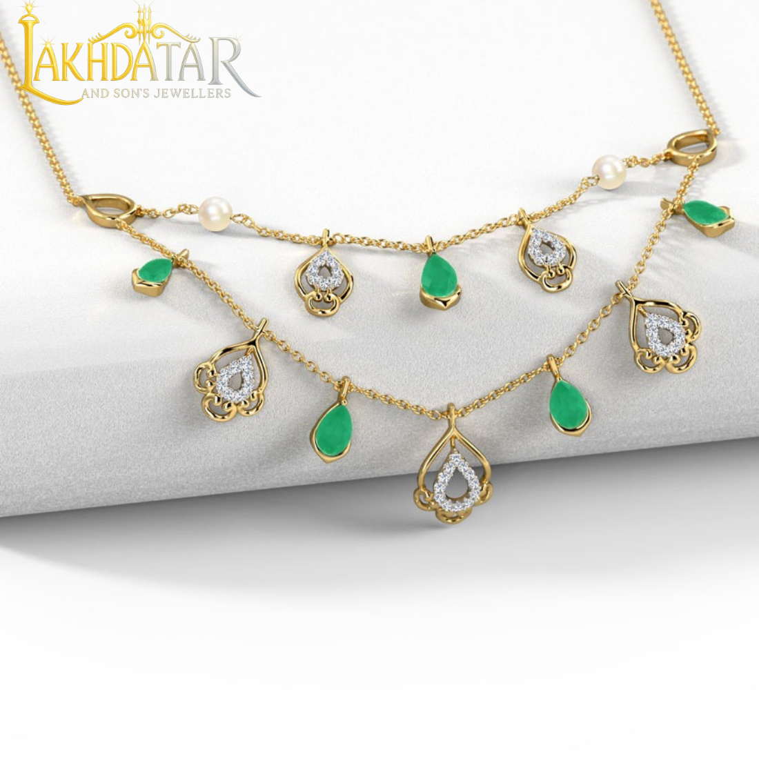 The Emerald Diamond Gold Necklace is a masterpiece that embodies elegance, luxury, and timeless charm. Featuring a vibrant green emerald as its centerpiece, gracefully surrounded by dazzling diamonds, this necklace is crafted in lustrous gold for an opulent finish. The deep green hues of the emerald symbolize prosperity and renewal, while the brilliance of diamonds adds unmatched sparkle. Perfect for weddings, festive occasions, and grand celebrations, this regal necklace makes a bold yet graceful statement. A true treasure for women who appreciate fine craftsmanship and everlasting beauty.