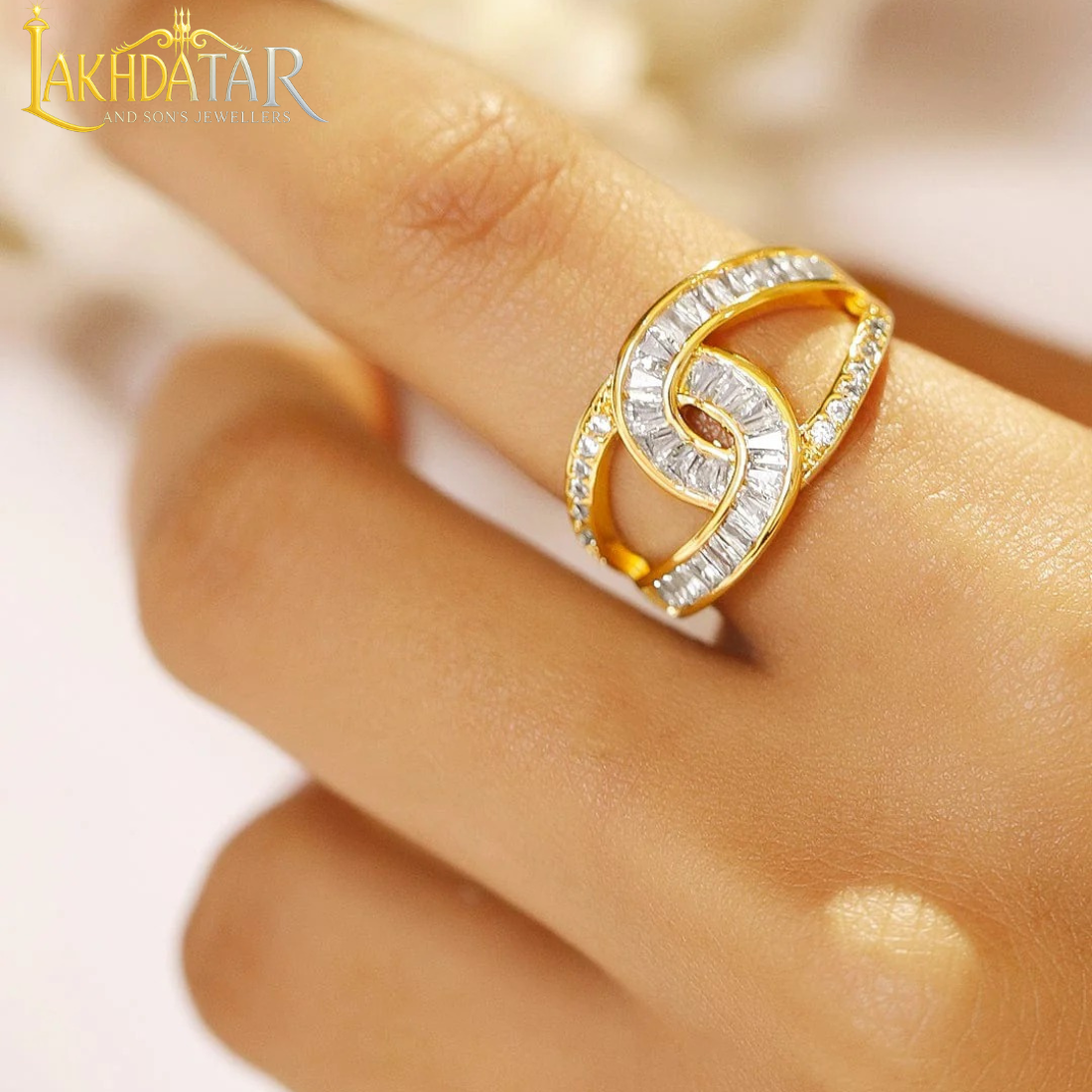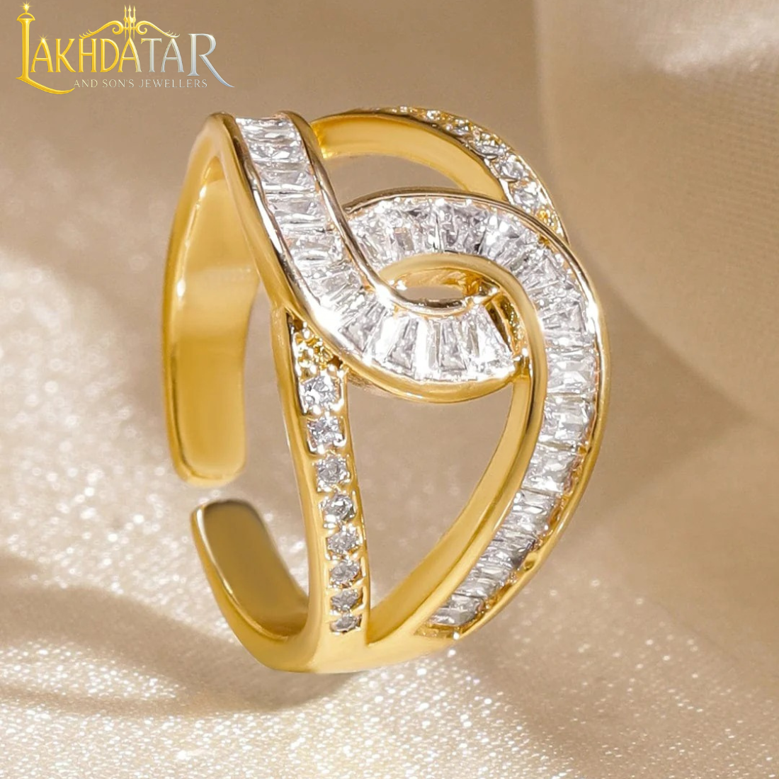 - Luxury Gold-Plated Swirl Bypass Ring with Baguette & Pavé CZ Stones